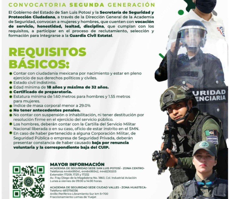 De la actual convocatoria, detalló que, debido a la instrucción del Mandatario Estatal de reclutar a 400 nuevos jóvenes, la fecha para recibir expedientes de las y los interesados se ampliará durante todo el mes de enero, por lo tanto, se brindará información en las sedes de la Academia Estatal de Seguridad en la zona Centro y Huasteca.