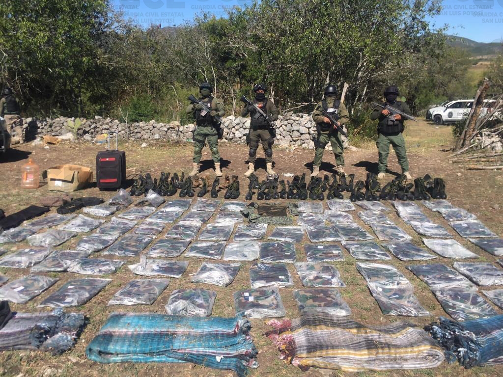 Luego de un minucioso trabajo que abarcó actividades de inteligencia, el grupo de operaciones especiales de la corporación estatal, se desplegó en un predio que posiblemente operaría como narco campamento, encontrando decenas de uniformes tipo militar, botas tácticas, chalecos anti balas y cobijas.
