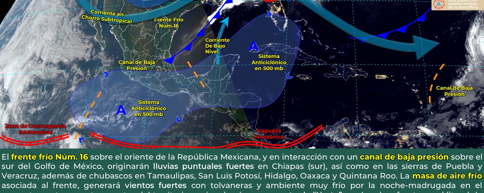 Intervalos de chubascos con lluvias puntuales fuertes (25 a 50 mm): Puebla, Veracruz, Oaxaca, Chiapas y Tabasco.