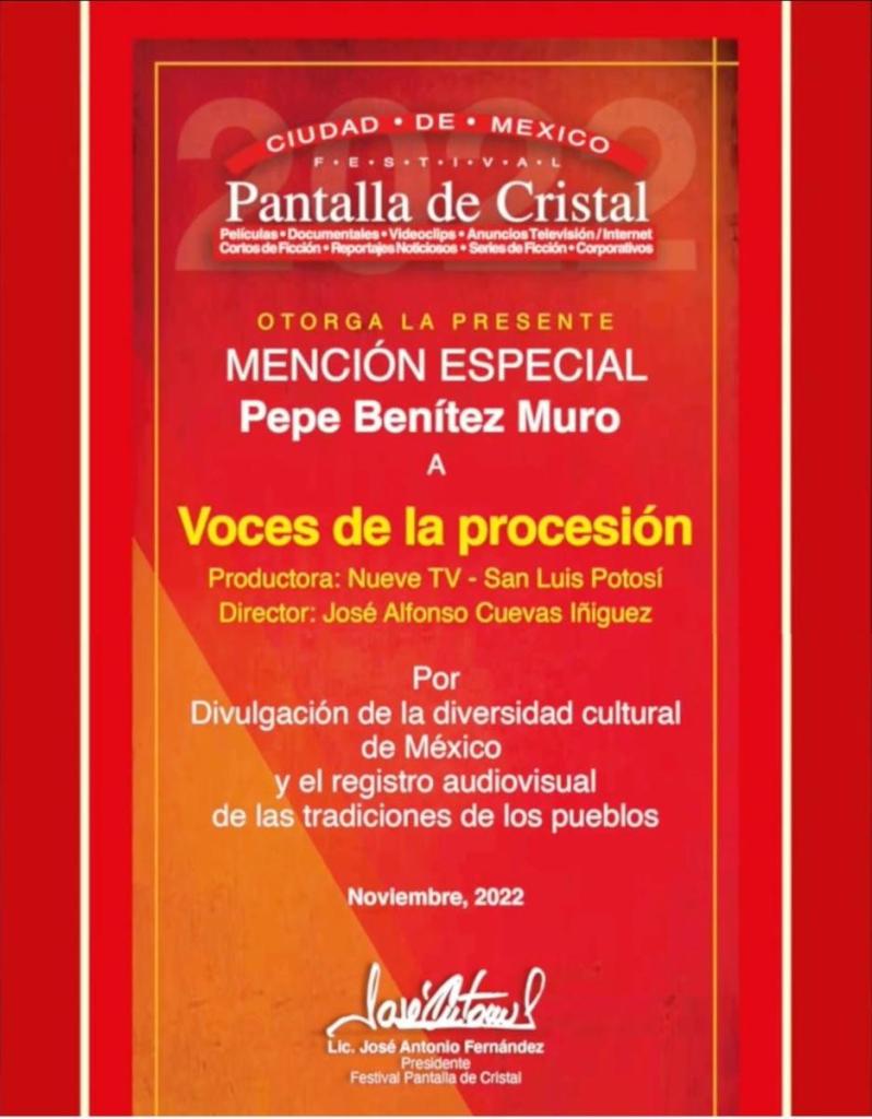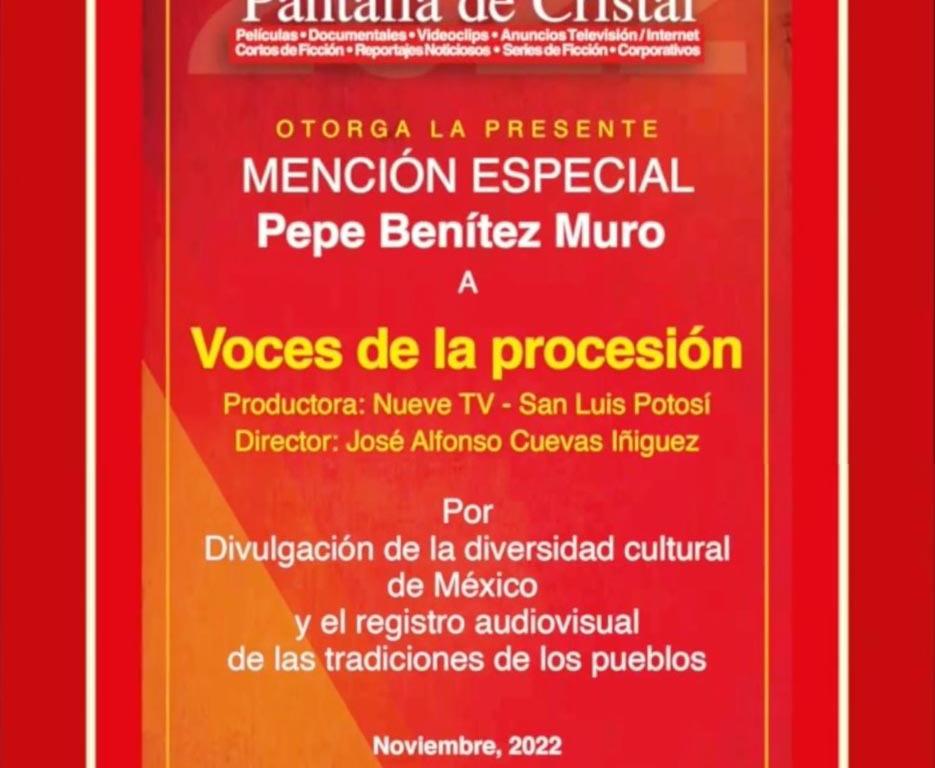 Resultado del esfuerzo por mejorar los contenidos públicos a favor de las y los potosinos y como parte del trabajo para la difusión cultural de las tradiciones locales, como lo ha definido el Gobernador de San Luis Potosí Ricardo Gallardo Cardona, este lunes fue premiado el documental “Voces de la Procesión” realizado por Nueve TV en el Festival de Cine Pantalla de Cristal con la Mención Especial Pepe Benítez Muro.