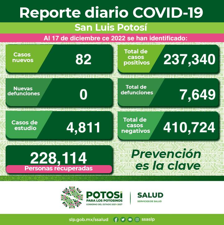 En cuanto a los casos Covid-19 en el Estado, se dan a conocer 82 nuevos contagios confirmados. De esta forma, el Comité Estatal para la Seguridad en Salud y los Servicios de Salud informan que, hasta este 17 de diciembre, se registran 237 mil 340 casos totales de este padecimiento.
