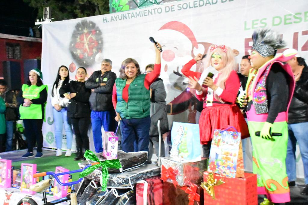 Las fiestas decembrinas llevadas a cabo por el Ayuntamiento de Soledad de Graciano Sánchez continúan llegando a cada rincón del municipio y en esta ocasión la alcaldesa Leonor Noyola Cervantes acompañada de su equipo de trabajo, visitó la Colonia Hogares Populares, San Antonio y la Constancia.
