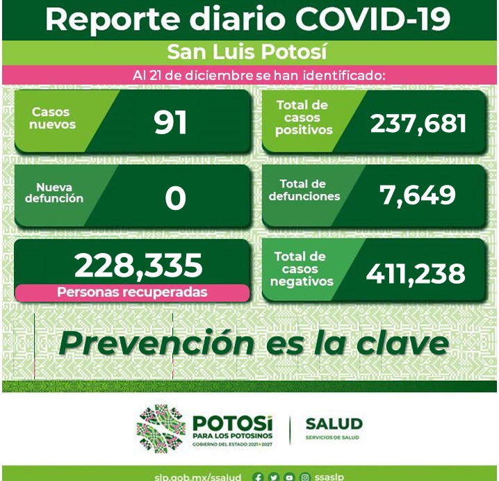 En cuanto a los casos Covid-19 en el Estado, se dan a conocer 91 nuevos contagios, confirmando el Comité Estatal para la Seguridad en Salud y los Servicios de Salud 237 mil 681 casos totales de esta enfermedad.