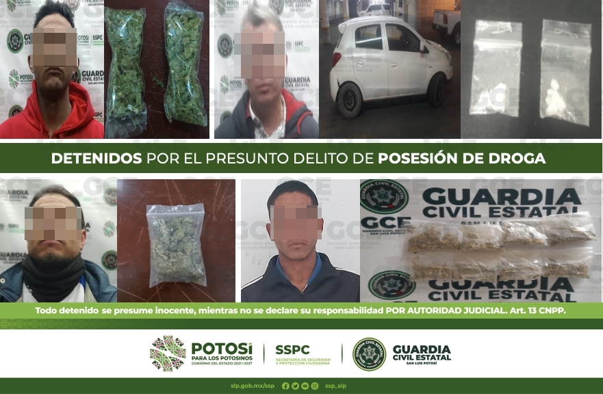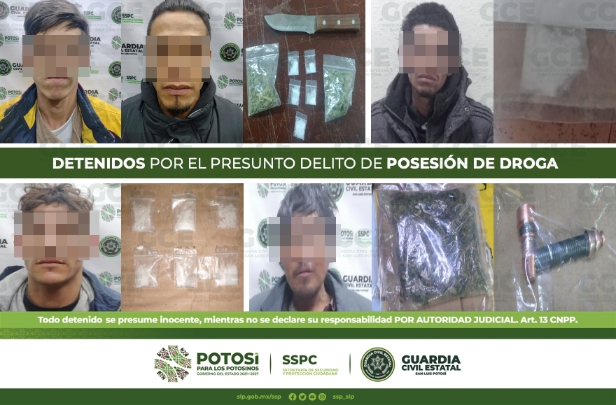 Derivado de las acciones de seguridad y vigilancia desdobladas en la Entidad potosina dentro del Plan Operativo «Otoño-invierno 2022», oficiales de la Guardia Civil Estatal (GCE) detuvieron a 9 personas por presunta posesión de droga.