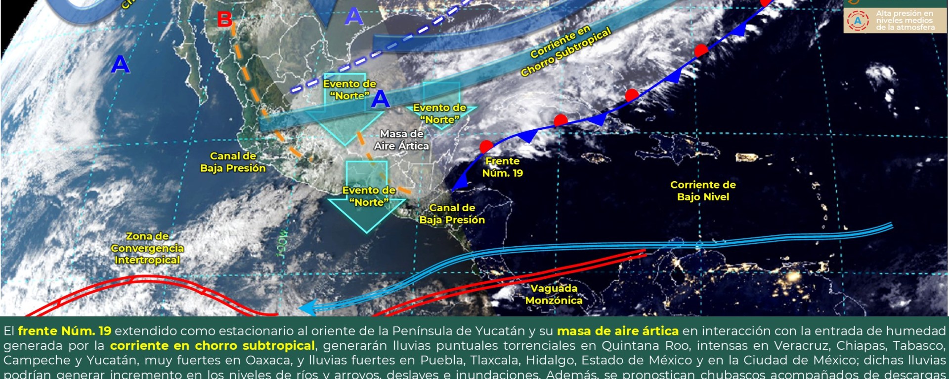 EL FRENTE NÚM. 19 Y SU MASA DE AIRE ÁRTICA MANTIENEN UNA ONDA GÉLIDA EN MÉXICO, ASÍ COMO EVENTO DE “NORTE” EN EL LITORAL DEL GOLFO DE MÉXICO E ISTMO Y GOLFO DE TEHUANTEPEC, CON NEVADAS EN ZONAS MONTAÑOSAS DEL CENTRO Y ORIENTE DEL PAÍS