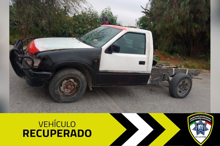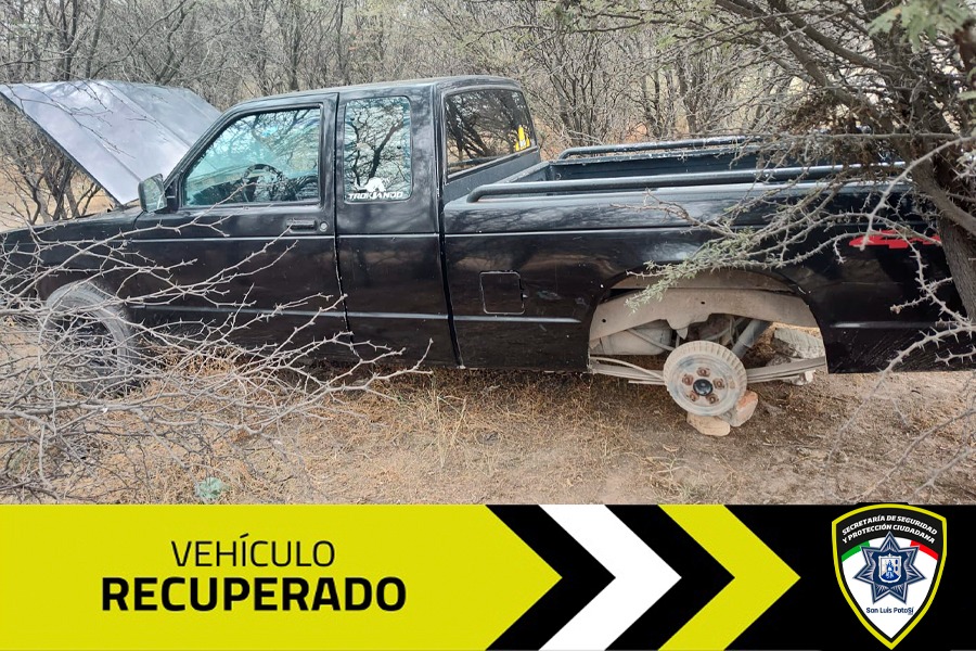 El primer vehículo localizado se trata de una camioneta marca Chevrolet tipo pick up color negra, misma que fue reportada por medio de radiofrecuencia en aparentes condiciones de abandono en un terreno baldío de la calle Netzahualcóyotl de la colonia Tercera Chica, al llegar al lugar, los oficiales municipales confirmaron la presencia de la unidad, la cual se encontraba abierta, con el cofre levantado, sin una llanta, y huellas visibles de desvalijamiento.