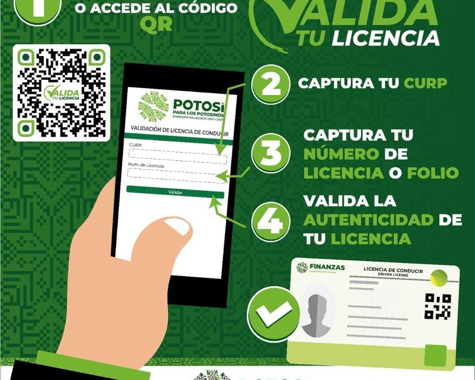 El programa denominado “Valida Tu Licencia” surge en respuesta a la política impulsada por el Gobernador del Estado, Ricardo Gallardo Cardona, para brindar garantía a la ciudadanía respecto de que la licencia tramitada no sea falsa y sea reconocida por las instituciones, con ello combatir a delincuentes y coyotes que lucran con la población.