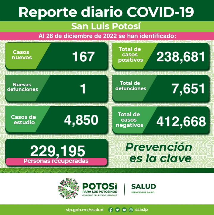 La cifra total de muertes en la entidad es de 7 mil 651 al ocurrir un nuevo deceso. Esta defunción corresponde a un hombre de 62 años de edad, entre los factores de riesgo se encuentran diabetes, hipertensión, obesidad, inmunosupresión y la edad, no contaba con esquema completo de vacunación contra Covid-19. Sobre los estudios de nuevos casos, 89 son mujeres y 78 hombres en un rango de edad de 2 a 85 años. Se encuentran hospitalizadas 23 personas, de las que ninguna requiere respiración asistida.