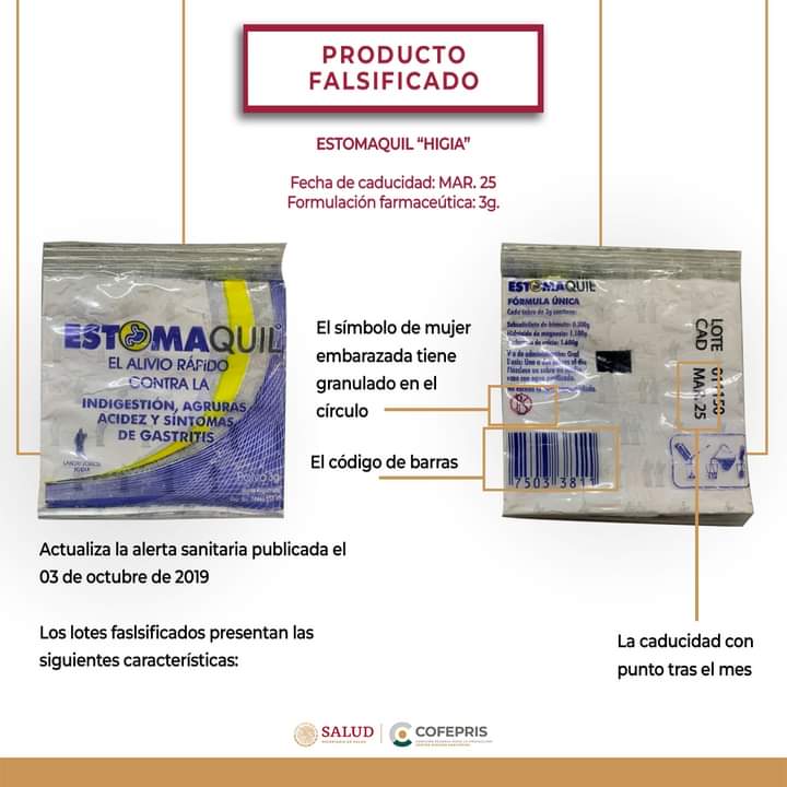 Estomaquil Higia es el quinto medicamento falsificado. Las características del producto ilegal van desde el número de lote 011150, fecha de vencimiento de marzo 2025 y dos leyendas: “Mézclese un sobre en medio vaso con agua purificada” y “No exceda la dosis recomendada”.
