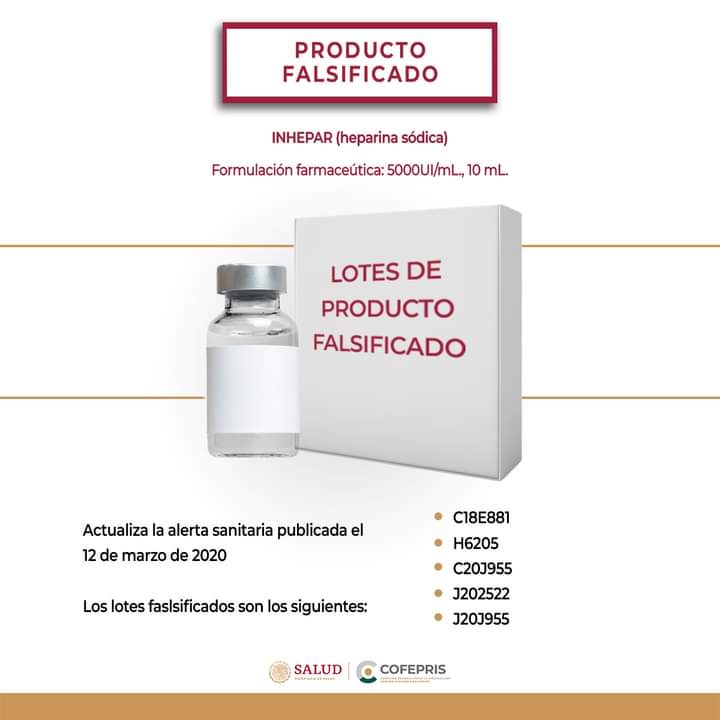 Finalmente, esta autoridad federal alerta sobre la venta ilegal de cinco lotes del medicamento Inhepar de 5000UI/ml, 10 ml, en presentación para el sector Salud: C18E881, H6205, C20J955, J202522 y J20J955.