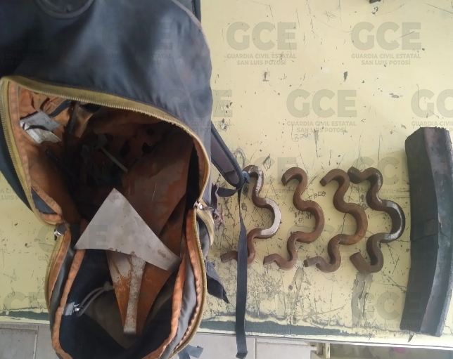 Los elementos de la GCE se trasladaron hacia las Vías México-Laredo en la comunidad de Milpillas, tras recibir la alerta de un masculino que trataba de huir con tres kilogramos de chatarra, consistente en cuatro anclas de fijación y una balata de frenado del tren.