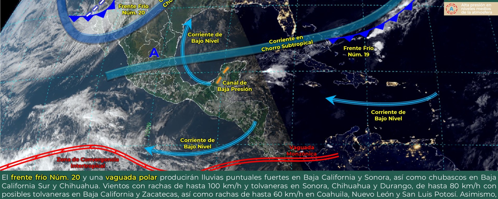 Cielo medio nublado a nublado la mayor parte del día, con probabilidad de lluvias fuertes en Chihuahua y chubascos en Coahuila y Durango. En el resto de la región cielo con nubosidad dispersa y sin lluvia. Por la mañana, ambiente muy frío a frío al amanecer y heladas sobre sierras; además de gélido con heladas y posibilidad de caída de aguanieve y/o nieve en zonas serranas de Chihuahua y Durango. Ambiente templado vespertino. Viento de dirección variable, con rachas de 60 a 70 km/h y tolvaneras en Chihuahua, Coahuila, Durango, Zacatecas y San Luis Potosí, así como rachas de 50 a 60 km/h y tolvaneras en Nuevo León y Aguascalientes.