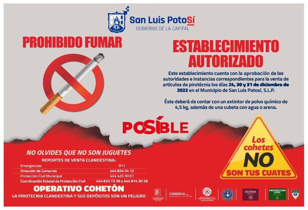 Este 30 y 31 de diciembre el equipo de inspectores de la Dirección de Comercio del Ayuntamiento de San Luis Potosí supervisa los puntos de venta de pirotecnia autorizados en diversos puntos de la Capital y las delegaciones de Villa de Pozos, La Pila y Bocas.
