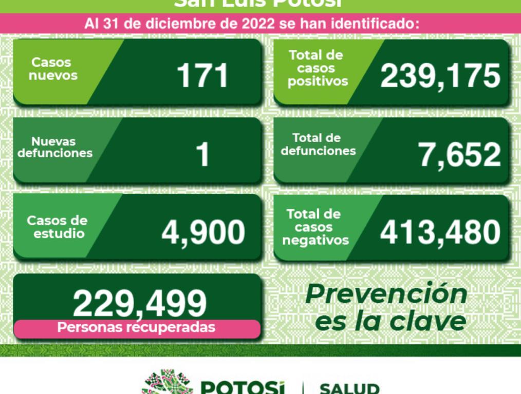 El Comité Estatal para la Seguridad en Salud y los Servicios de Salud, informan que, hasta este sábado 31 de diciembre, se registran 239 mil 175 casos totales de Covid-19, con la confirmación de 171 nuevos contagios en las últimas 24 horas.
