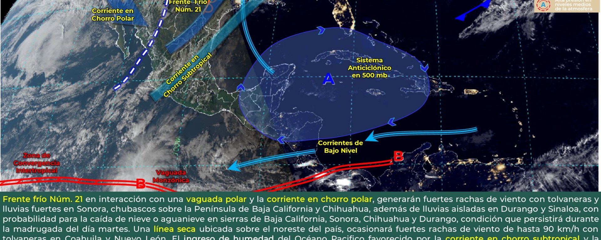 Viento con rachas de 60 a 70 km/h y tolvaneras: Baja California, Sonora, Chihuahua, Coahuila y Durango.