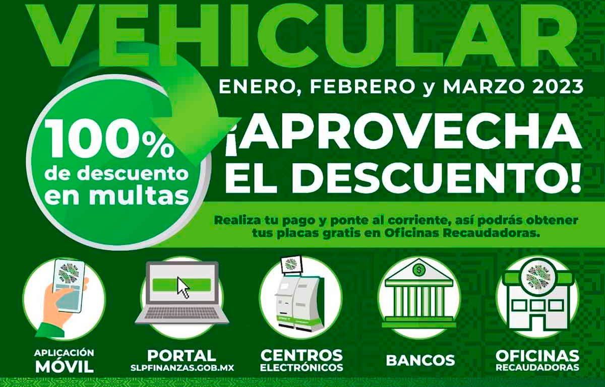 La dependencia invitó a la población a que realicen el pago de control vehicular 2023 en los meses de enero, febrero y marzo, sin multas ni recargos; en el concepto de canje anual de los ejercicios 2018 a 2022 se aplicará el 100 por ciento de descuentos en multas y en alta de vehículos nuevos también el 100 por ciento de descuentos en multas y para las y los contribuyentes de la tercera edad se aplica el descuento del 50 por ciento.