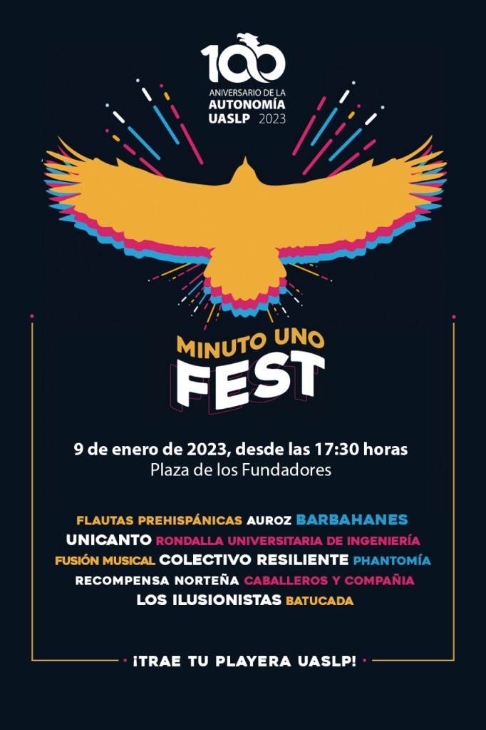 Para ello, se iniciará con el concierto en Plaza de Los Fundadores denominado MinutoFest, que se realizará el 9 de enero por la noche para recibir el 10 de enero con una fiesta musical de bandas compuestas por alumnos, académicos, ex alumnos, administrativos, todos, parte de la comunidad UASLP.