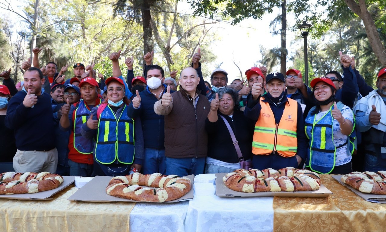 El Presidente Municipal de San Luis Potosí, Enrique Galindo Ceballos, reunido con trabajadoras y trabajadores de la Coordinación de Parques y Jardines de la Dirección de Servicios Municipales, partió la tradicional Rosca de Reyes este 6 de enero. Ahí, el Alcalde externó su agradecimiento por el ahínco con que realizan sus actividades, cada uno desde su trinchera, todos los días en beneficio de la ciudad y la población.