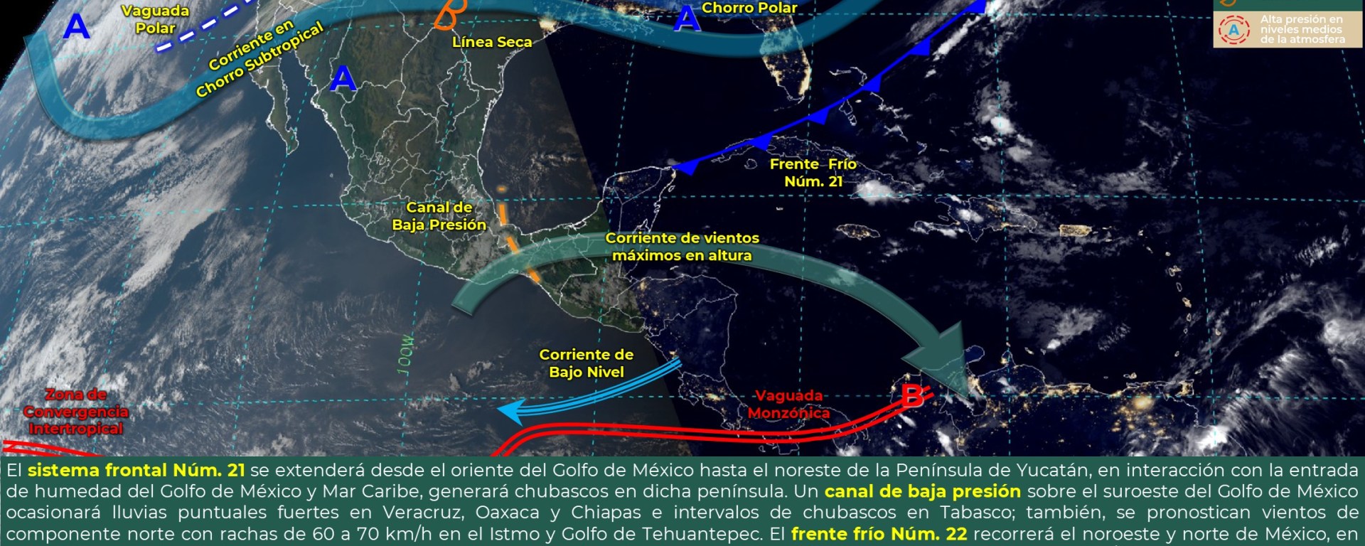Intervalos de chubascos (5 a 25 mm): Veracruz (sur), Tabasco, Oaxaca, Chiapas, Campeche y Yucatán