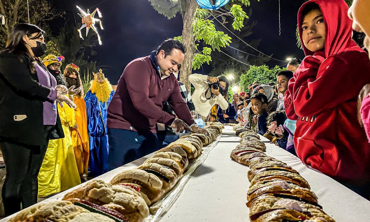El evento que se realizó en el jardín principal, en el que se tuvo la rosca monumental que midió más de 2.5 kilómetros y en la que tanto niñas, niños, adolescentes con sus papás y abuelos acudieron entusiasmados a ser partícipes de esta tradición, en la que se tuvieron varias sorpresas como regalos a los menores de edad, entre ellos, juguetes que fueron entregados por el alcalde de Villa de Reyes en compañía de los Tres Reyes Magos: Melchor, Gaspar y Baltazar, además de que muchos de los asistentes se tomaron la tradicional foto del recuerdo con ellos.
