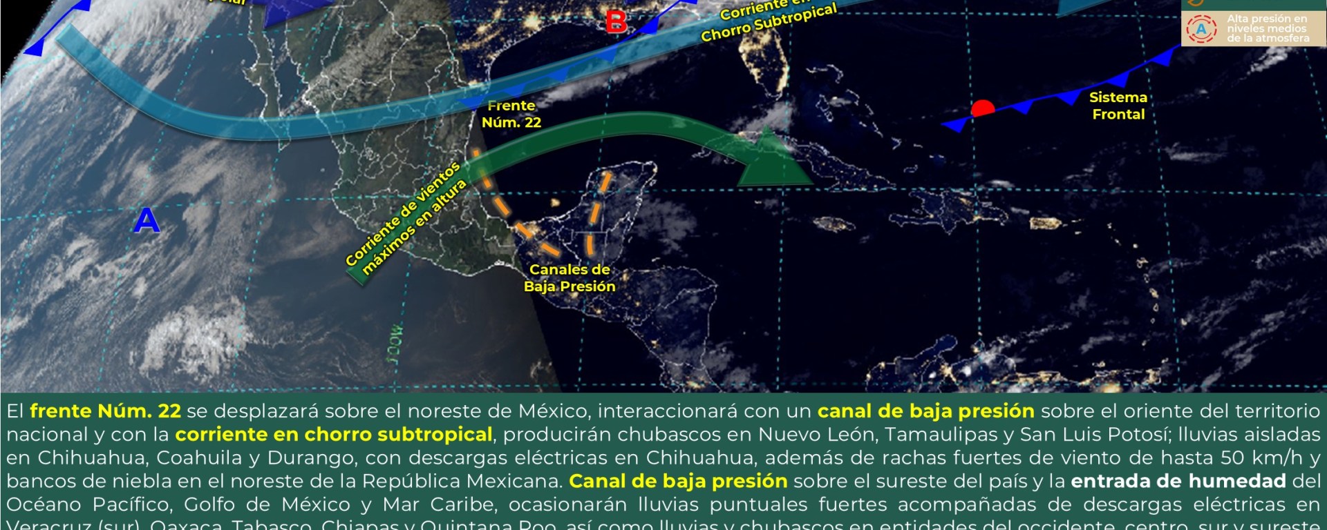 Intervalos de chubascos (5 a 25 mm): Nuevo León, Tamaulipas, San Luis Potosí, Hidalgo, Puebla, Campeche, Yucatán.