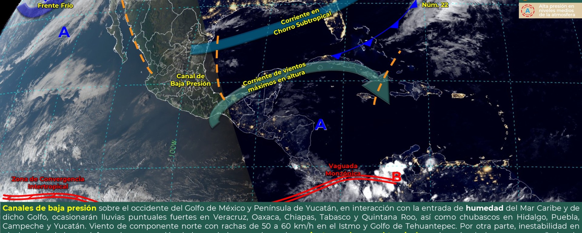 Viento de componente norte con rachas de 60 a 70 km/h: Istmo y Golfo de Tehuantepec.