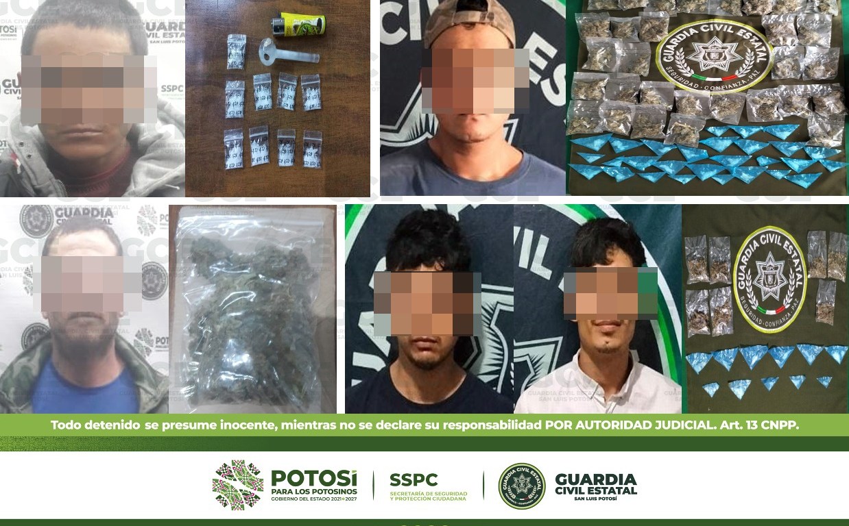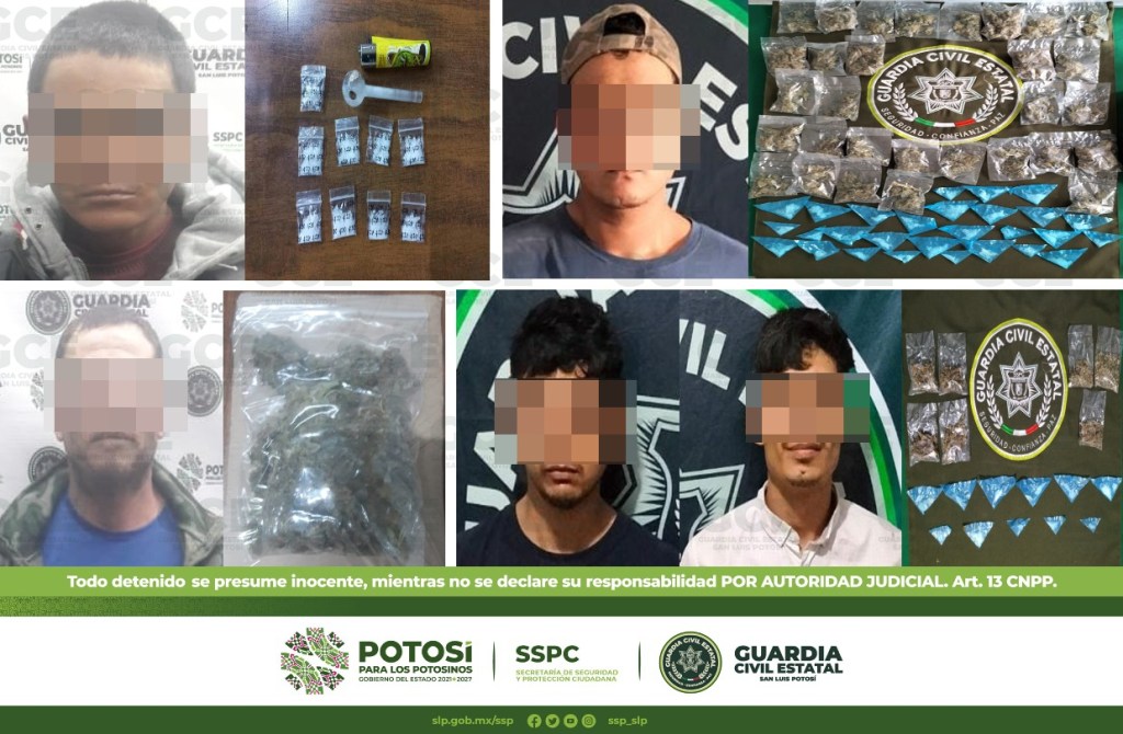 Derivado de las acciones de seguridad desplegadas dentro del Plan Integral de Seguridad y de los trabajos de análisis e inteligencia desdoblados en los 58 municipios del Estado potosino, agentes de la Guardia Civil Estatal (GCE) detuvieron a 5 presuntos narcomenudistas y aseguraron 100 dosis de estupefacientes.