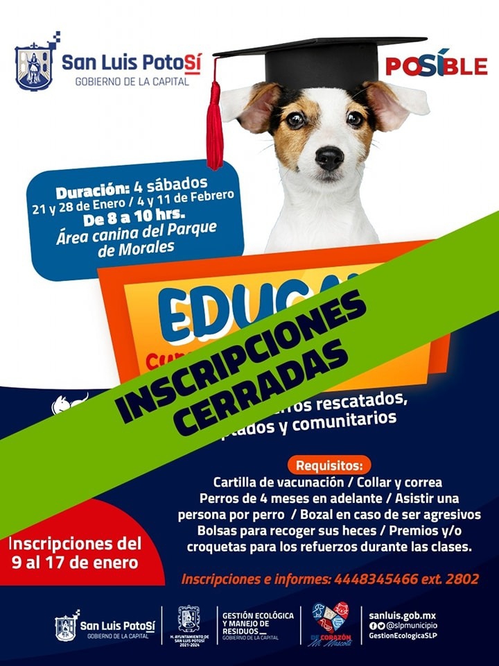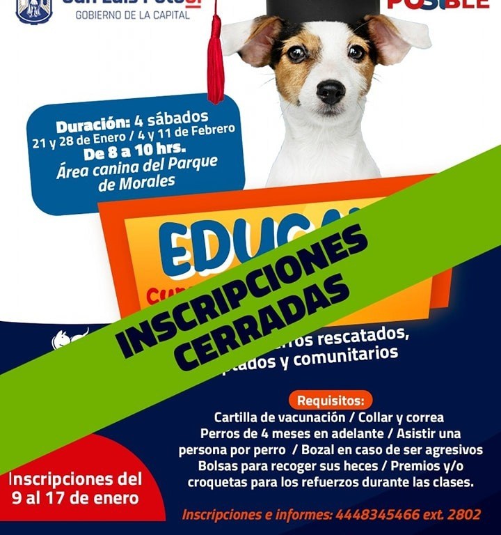 En el marco del programa “De Corazón Mi Mascota”, la Dirección de Gestión Ecológica y Manejo de Residuos del Ayuntamiento de la Capital, a través del área de Bienestar Animal, en coordinación con la Fundación “Dog Mom SLP”, dieron a conocer que debido a la gran respuesta e interés de la ciudadanía en el curso de adiestramiento básico gratuito EduCAN, cerraron las inscripciones.