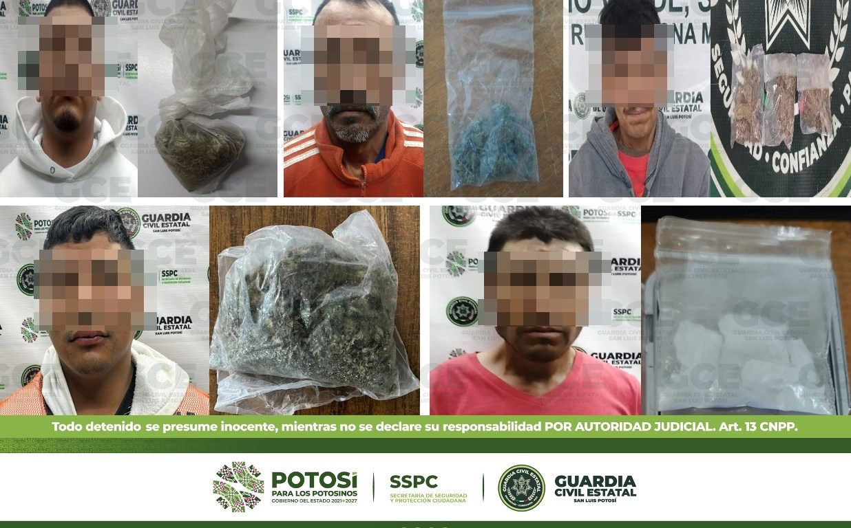 En el marco de los operativos de seguridad desdoblados en las cuatro regiones del Estado, con el fin de coadyuvar a evitar la venta y consumo de droga entre la población potosina, 9 personas fueron detenidas por la Guardia Civil Estatal (GCE) por el supuesto delito de posesión de droga.
