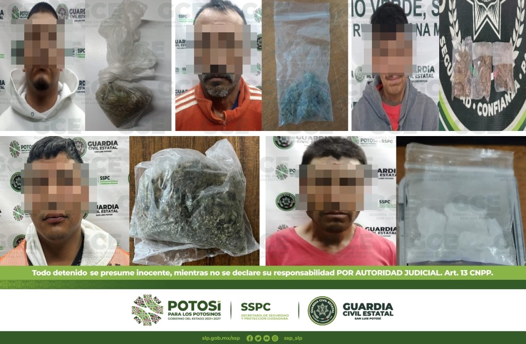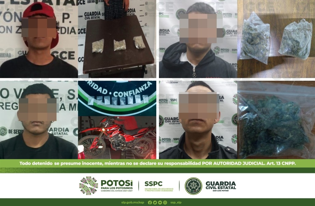 A su vez, en la zona Media, tres hombres fueron detenidos: en Barrio El Rasconcito, en el municipio de Cárdenas, fue detenido Omar de 18 años de edad al asegurarle 42 gramos de marihuana, distribuidos en tres dosis; en la zona centro de Ciudad Fernández, fue detenido Luis de 21 años con 9 dosis de “cristal”, también se le aseguró una motocicleta marca Vento, modelo 2022, color negro con rojo, en la que se desplazaba; por último, en la colonia San Marcos, en el municipio de Rioverde, fue detenido Javier de 42 años de edad con tres bolsas que contenían marihuana.