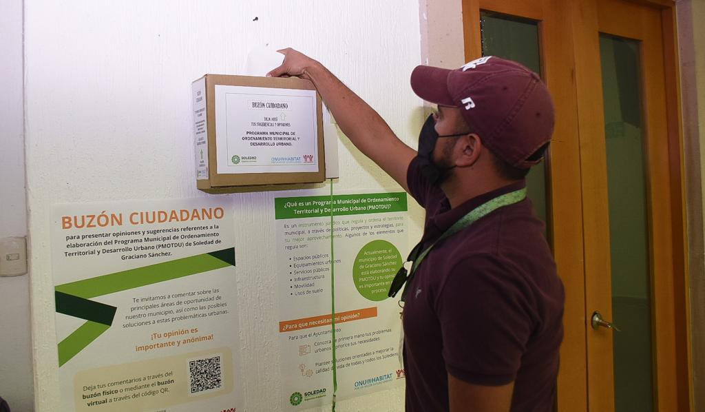 El Palacio Municipal de Soledad de Graciano Sánchez, fue el edificio seleccionado para la instalación del “Buzón Ciudadano”, herramienta que permitirá obtener opiniones y sugerencias de parte de las y los soledenses, las cuales, serán de gran apoyo para robustecer la elaboración del documento municipal.