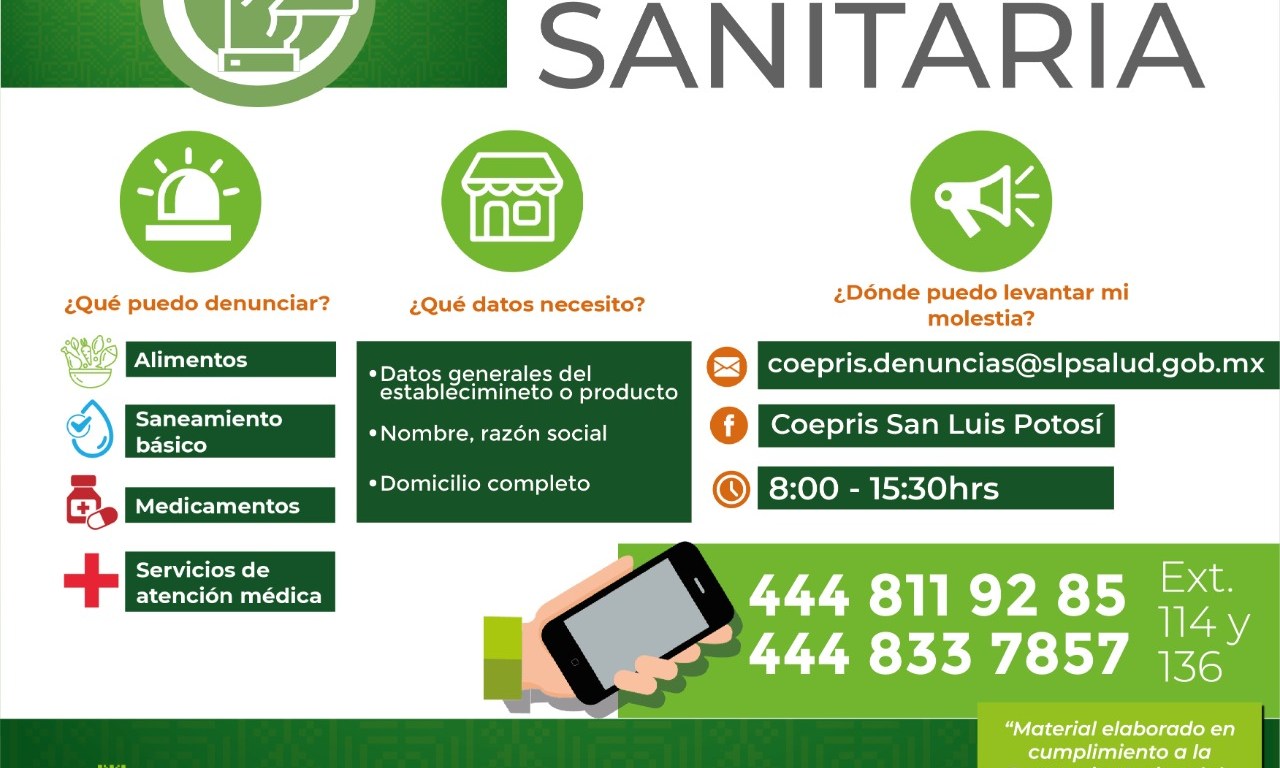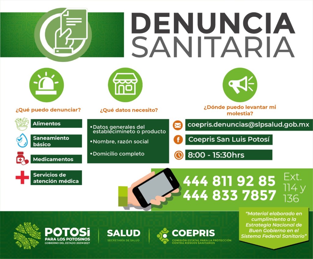 La denuncia sanitaria tiene por objeto, poner de conocimiento a la autoridad los hechos, actos u omisiones en materia sanitaria que de acuerdo a la perspectiva del denunciante, provoque un riesgo o daño a la salud de la población; la queja puede enviarse al correo electrónico coepris.denuncias@slpsalud.gob.mx. en la página http://coepris.slpsalud.gob.mx o bien, directamente en la ventanilla de los siete Centros Integrales de Servicios ubicados para el interior del estado en las instalaciones de las Jurisdicciones Sanitarias y para la capital potosina, el Centro Integral se encuentra en las instalaciones de la COEPRIS ubicadas en la calle 05 de mayo No. 1485, Barrio de San Miguelito.