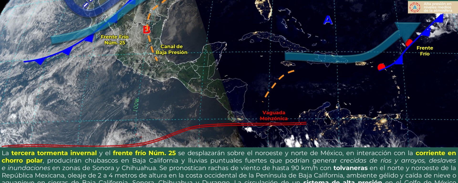 Viento de componente sur (surada) con rachas de 60 a 70 km/h: Istmo de Tehuantepec, y con rachas de 50 a 60 km/h: Tamaulipas, Veracruz, Campeche, Yucatán y Quintana Roo.