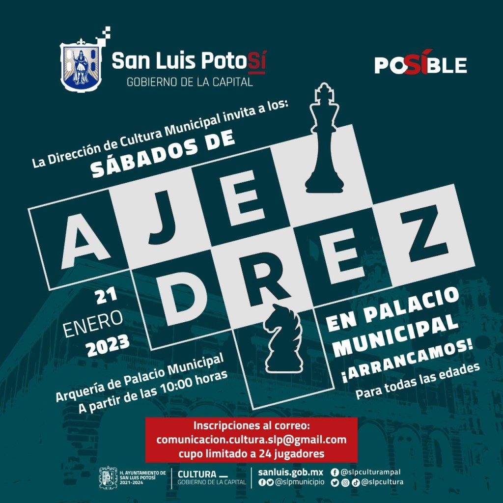 El H. Ayuntamiento de San Luis Potosí, a través de la Dirección de Cultura Municipal, arrancará el programa Sábados de Ajedrez en Palacio Municipal, en la que también se ofrecerá una clase de principios básicos de ajedrez, para el público que guste del deporte ciencia, eventos que serán gratuitos.