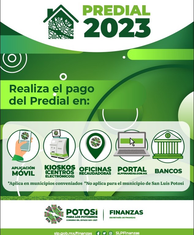 Los municipios con convenio para pago de predial son: Ahualulco, Alaquines, Armadillo de los Infante, Axtla, Cárdenas, Cerritos, Ciudad del Maíz, Coxcatlán, Charcas, Ébano, El Naranjo, Guadalcázar, Huehuetlán, Lagunillas, Mexquitic de Carmona, Moctezuma, Rayón, San Antonio, San Ciro de Acosta, San Martín Chalchicuautla, San Nicolás Tolentino, San Vicente, Santa Catarina, Santo Domingo, Soledad de Graciano Sánchez, Tamasopo, Tamazunchale, Tampacán, Tampamolón, Tancanhuitz, Tanlajás, Tanquián, Vanegas, Venado, Villa de Ramos, Villa Juárez y Xilitla.