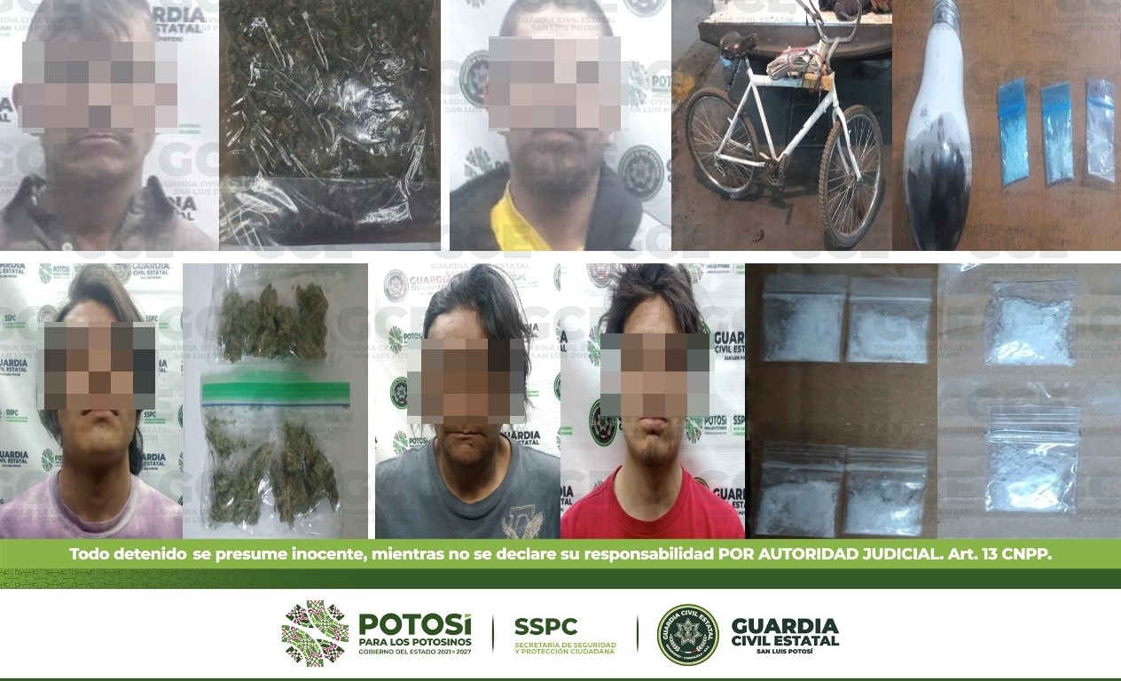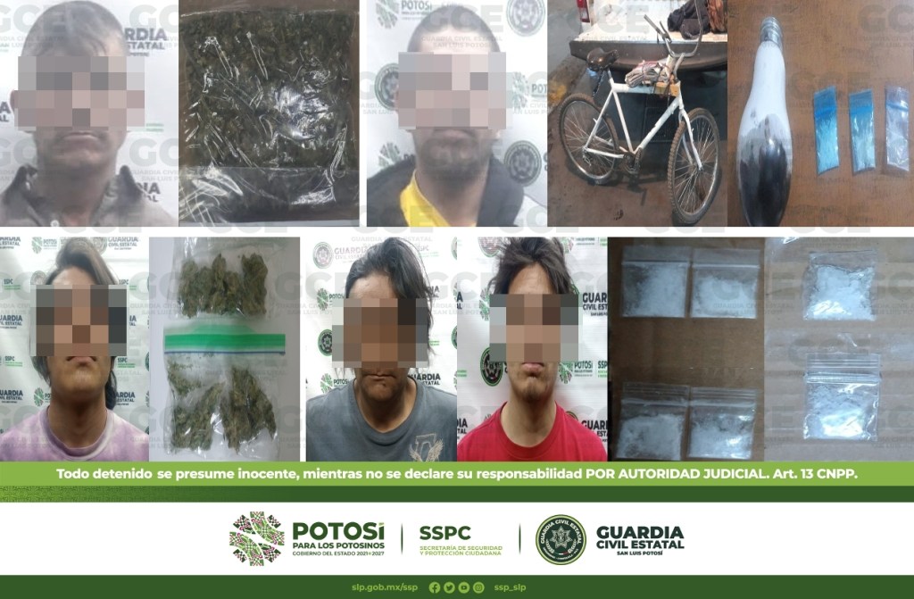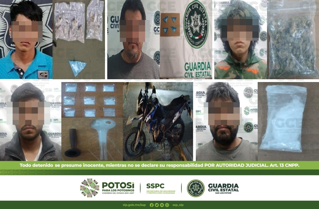 En distintas acciones, y en el marco del despliegue del Plan Integral de Seguridad, oficiales de la Guardia Civil Estatal (GCE) efectuaron la detención de 10 personas por probables delitos contra la salud, en su modalidad de posesión de droga, logrando inhibir que este tipo de sustancias nocivas lleguen hacia la población potosina, particularmente a la juvenil.