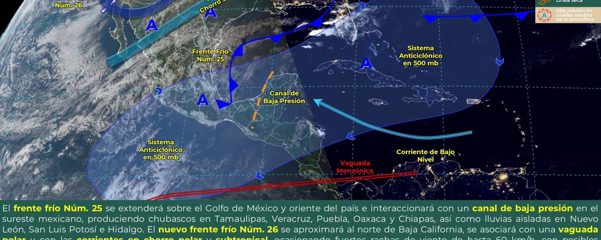 Viento con rachas de 50 a 60 km/h: Golfo de California, y con posibles tolvaneras: Baja California, Baja California Sur, Durango, Zacatecas y Coahuila.