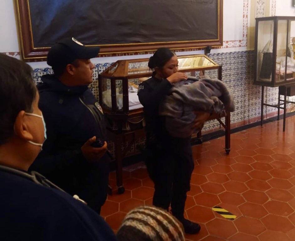 Oficiales municipales de la Secretaría de Seguridad y Protección Ciudadana de la Capital acudieron como primer respondiente al auxilio ciudadano que indicaba el hallazgo de una recién nacida en la iglesia de Tlaxcala.