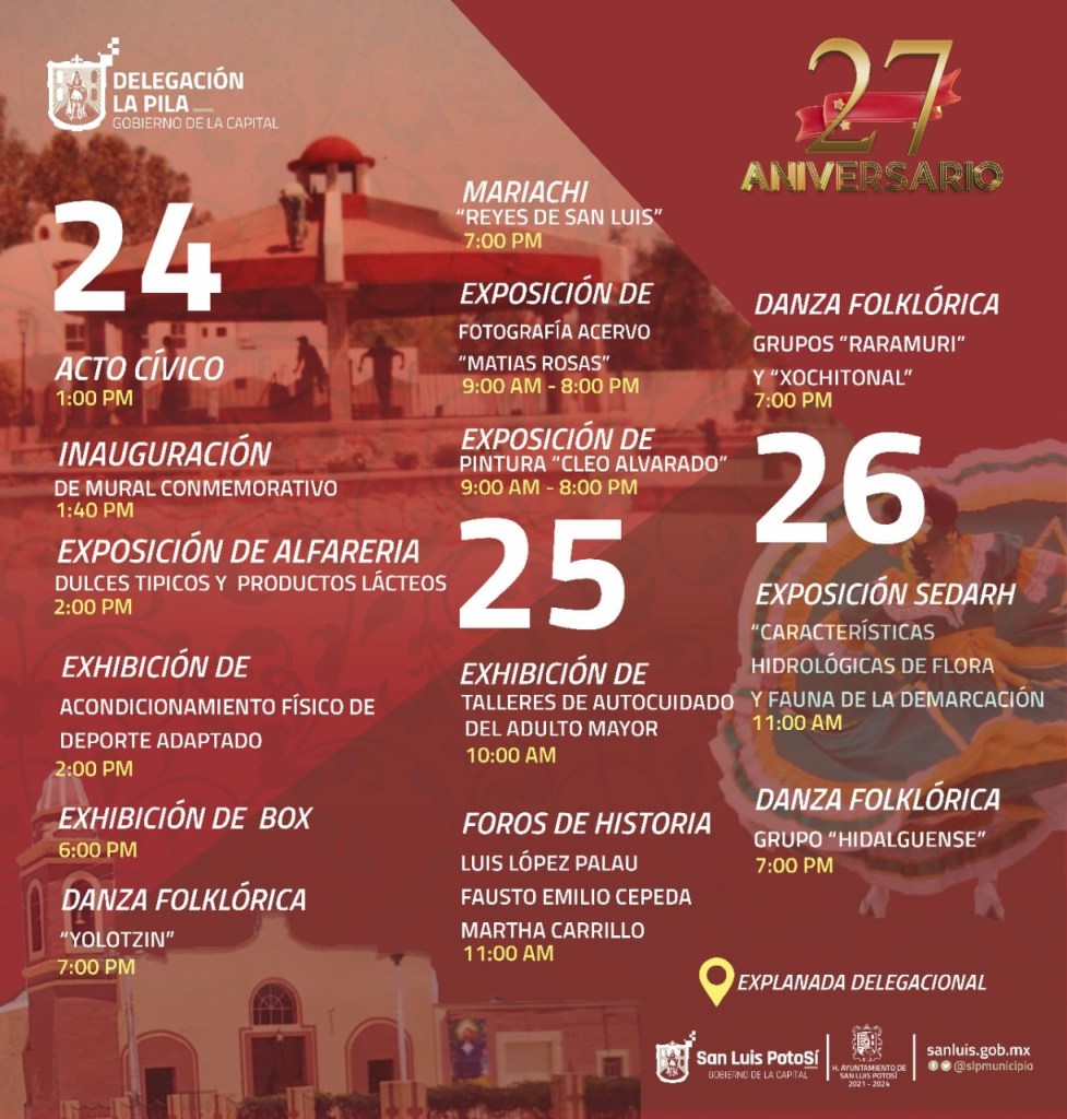 El funcionario municipal, destacó que en el marco del 27 aniversario se contará con un programa de gran importancia, pues los habitantes de la delegación La Pila y de todo San Luis Potosí, tendrán la oportunidad de acudir y disfrutar de una gama de eventos para toda la familia.