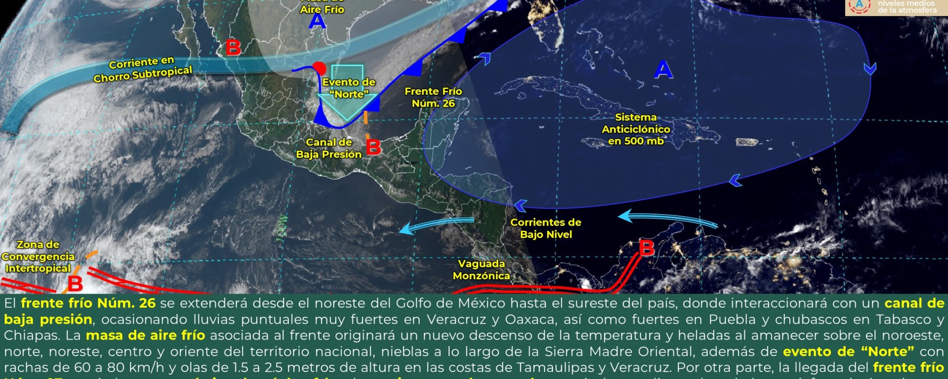 Temperaturas mínimas de -5 a 0 °C con heladas: zonas montañosas de Coahuila, Nuevo León, Tamaulipas, Aguascalientes, Jalisco, Guanajuato, Estado de México, Tlaxcala, Puebla y Veracruz.