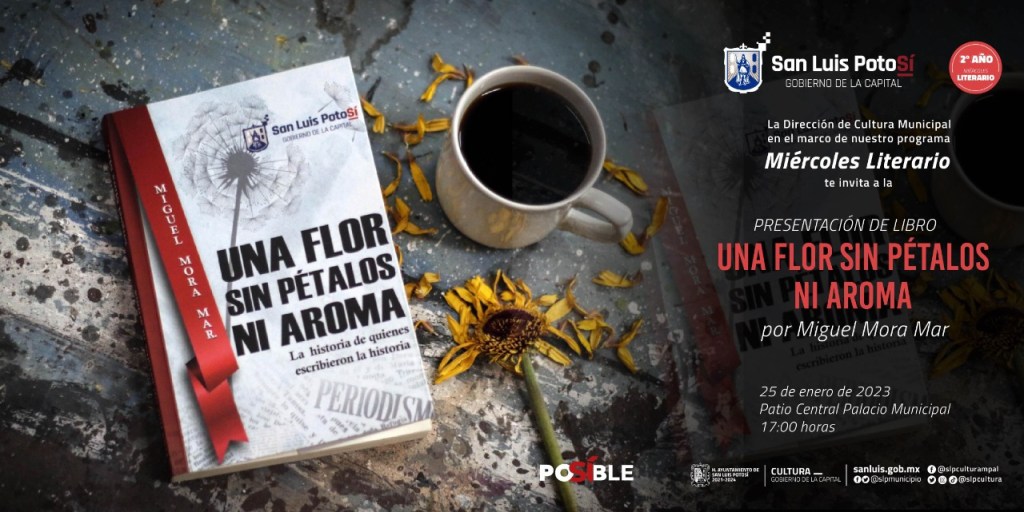 El H. Ayuntamiento de San Luis Potosí, a través de la Dirección de Cultura Municipal, presentará el libro “Una flor sin pétalos ni aroma”, del periodista Miguel Mora Mar, La historia de quienes escribieron la historia, en el marco del tradicional Miércoles Literario en el Centro Cultural Palacio Municipal, este 25 de enero a las 5 de la tarde.
