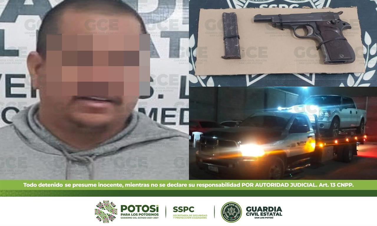 Los uniformados recorrían la avenida San Luis en la comunidad de San Martín, lugar en donde fue detenido José de 41 años de edad quien fue detectado en la zona y abordado por los uniformados, tras intentar huir de la presencia de los elementos estatales. Tras realizar una inspección de seguridad, al presunto se le aseguró un arma de fuego calibre .22, con un cargador desabastecido y una camioneta marca Ford, tipo Pick Up, color gris, modelo 2012, con placas de esta Entidad.