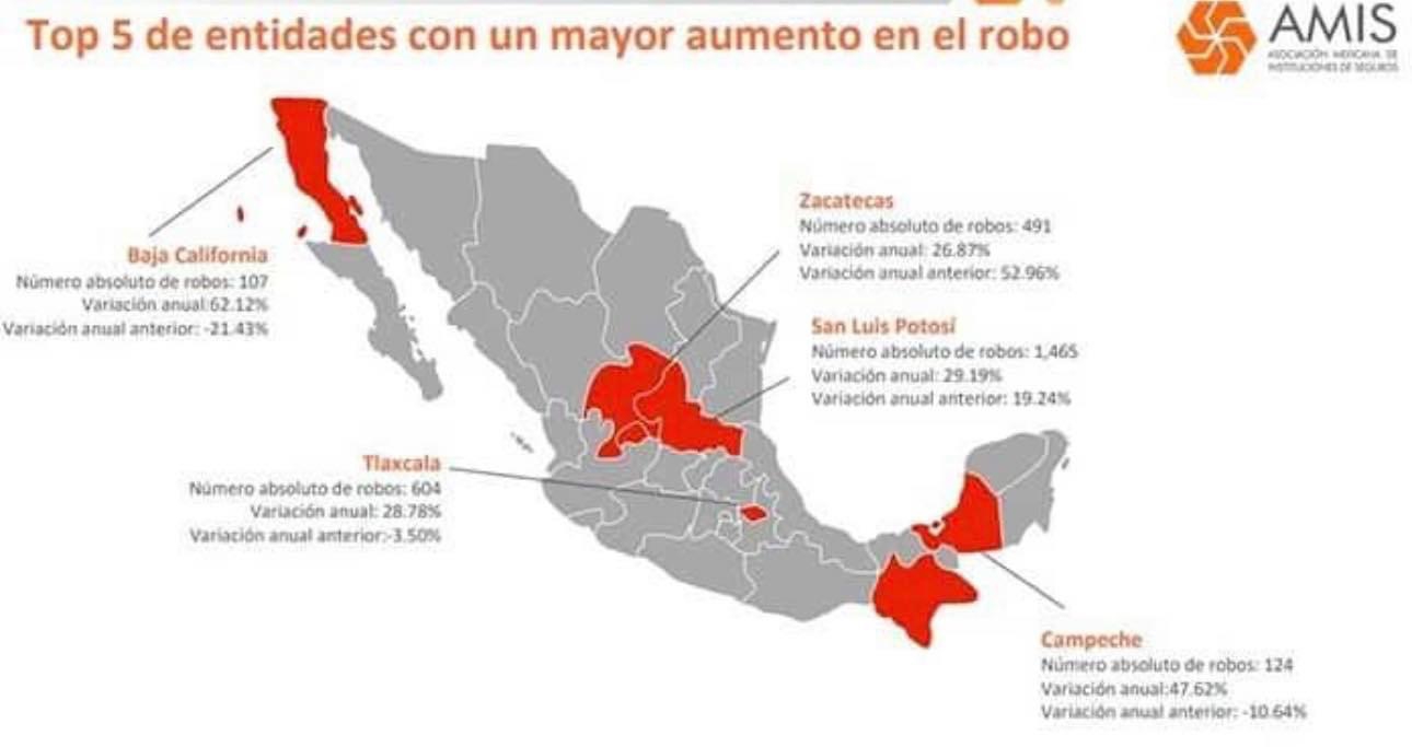 Según las base de datos de la Asociación Mexicana de Instituciones de Seguros (AMIS) en el 2022 en San Luis Potosí, se registraron mil 465 unidades robadas que contaban con seguro.