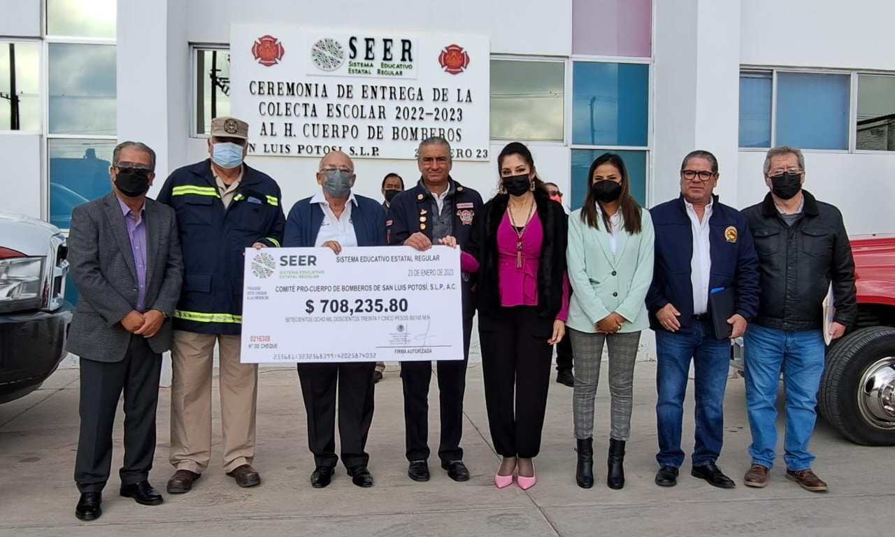 En seguimiento al trabajo emprendido por el Gobernador de San Luis Potosí, Ricardo Gallardo Cardona, este lunes, el Sistema Educativo Estatal Regular (SEER) entregó al H. Cuerpo de Bomberos de San Luis Potosí, un cheque por la cantidad de 708 mil 235 pesos con ochenta centavos, producto de la Colecta Escolar 2022-2023 realizada entre alumnos, personal administrativo, directivos y docentes de las escuelas oficiales y particulares pertenecientes a esta dependencia educativa.