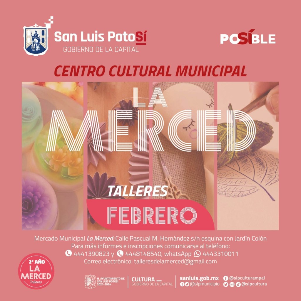 El Centro Cultural La Merced se ubica en el segundo piso del Mercado Municipal Tangamanga, calle Pascual M. Hernández s/n esquina con Jardín Colón. Para más informes e inscripciones las y los interesados pueden comunicarse al teléfono 4441390823, 4443310011, o al correo: talleresdelamerced@gmail.com; o bien contactarnos a través de nuestras redes sociales Facebook @SLPCulturaMpal o @slpcultura en Instagram, Twitter y TikTok.