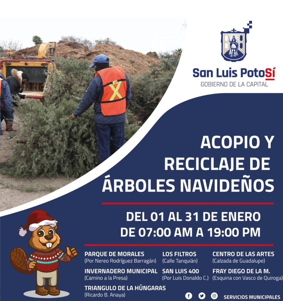 A fin de mantener la imagen de la ciudad, el Ayuntamiento de San Luis Potosí recordó a la población en general que siguen en operación los centros de acopio y reciclaje de árboles naturales de Navidad e hizo el exhorto para que lo usen exclusivamente para este objetivo.