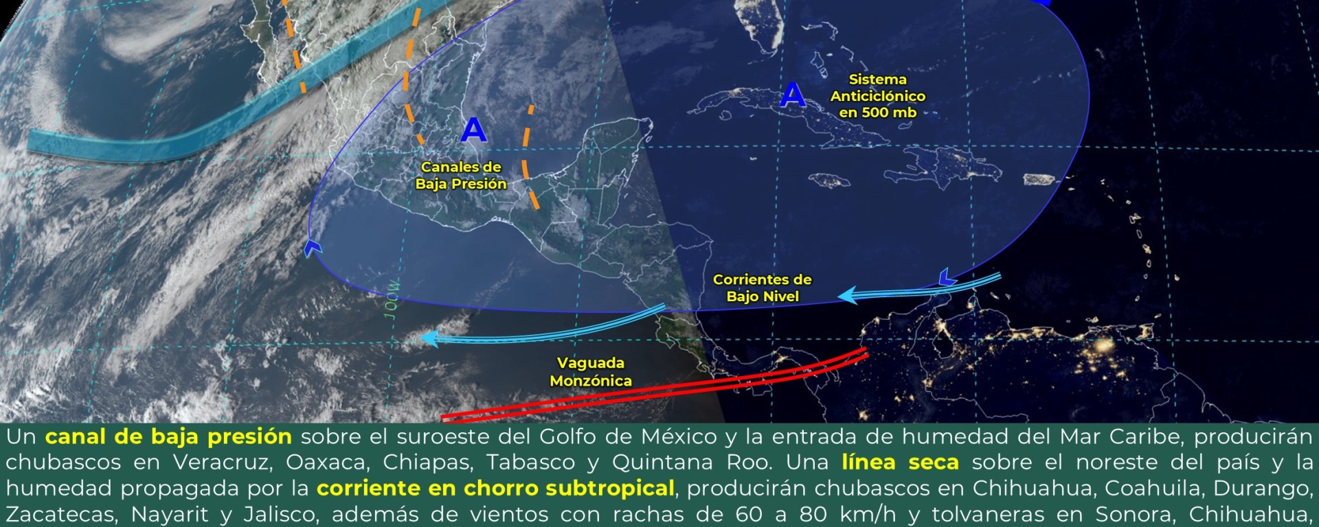 Viento con rachas de 60 a 70 km/h: Golfo de California, y con tolvaneras: Baja California, Sonora, Chihuahua, Durango y Zacatecas.