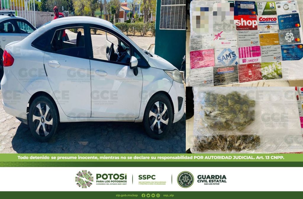 En el municipio de Soledad de Graciano Sánchez, en la colonia 21 de Marzo, fue detenido Miguel de 40 años de edad a quien se le aseguraron tres dosis de marihuana; sobre el Circuito San Andrés en la colonia Santo Tomás, fue asegurado un automotor marca Ford, tipo Fiesta, modelo 2012, color blanco, sin placas, el cual estaba abandonado y en su interior se aseguraron 12 dosis de “cristal” y tres de marihuana, así como 23 tarjetas diversas, tanto de bancos, tiendas departamentales e identificaciones.