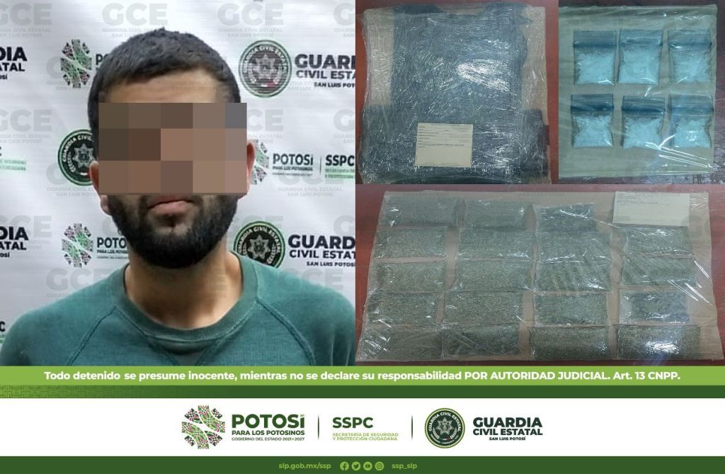 En el municipio de Tamuín, durante los operativos emitidos en la colonia Las Brisas, fue detenido Juan de 25 años de edad como resultado de los trabajos de inteligencia, logrando asegurarle 5 dosis de “cristal” y 8 dosis de marihuana: dicha persona ha sido detenida por presunta posesión de droga en tres ocasiones diferentes, siendo la última el 21 de enero del año en curso. Por último, en el municipio de Axtla de Terrazas sobre la carretera estatal Comoca-Axtla, la GCE detuvo a Carlos de 36 años de edad con 6 dosis de “cristal”.