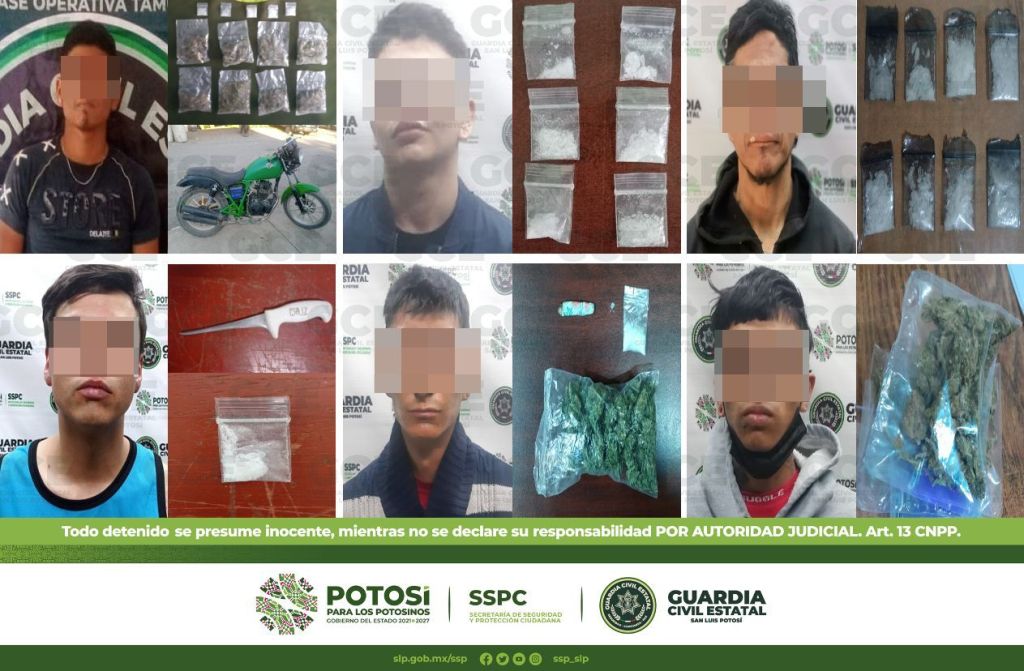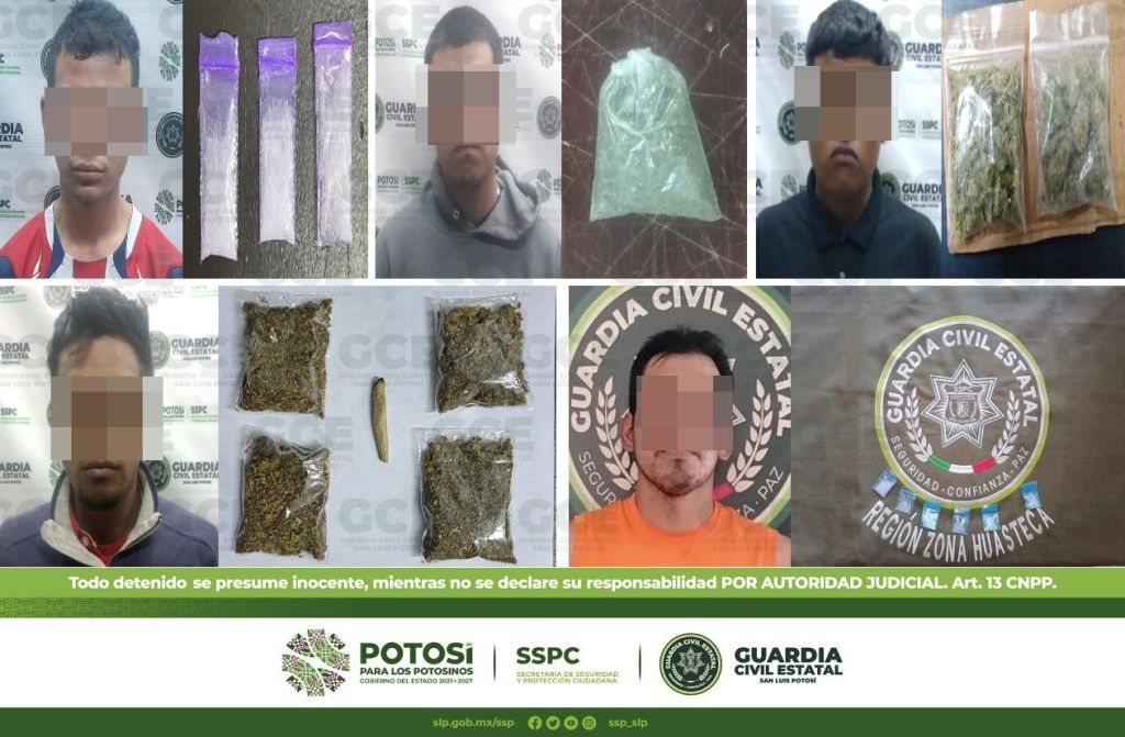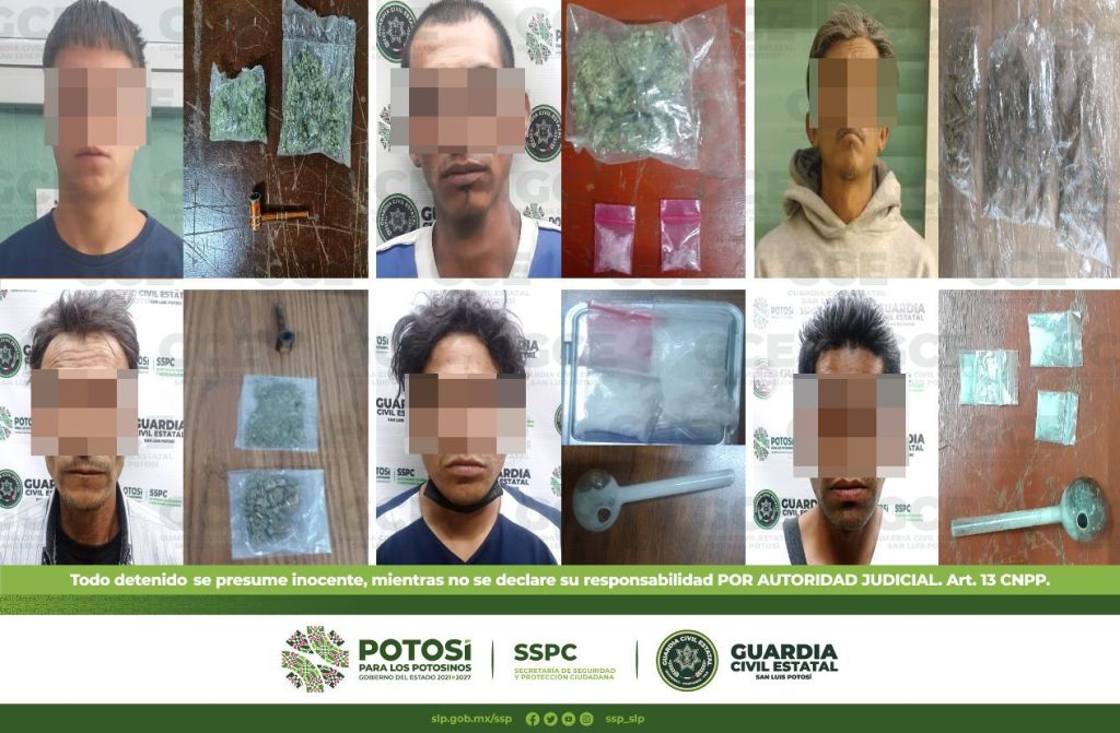 Como resultado de los trabajos de análisis e inteligencia y de los operativos disuasivos para inhibir la venta y consumo de droga entre la población potosina, la Guardia Civil Estatal (GCE) detuvo a 18 personas por presunta posesión de enervantes, logrando asegurar 106 dosis de estupefacientes.